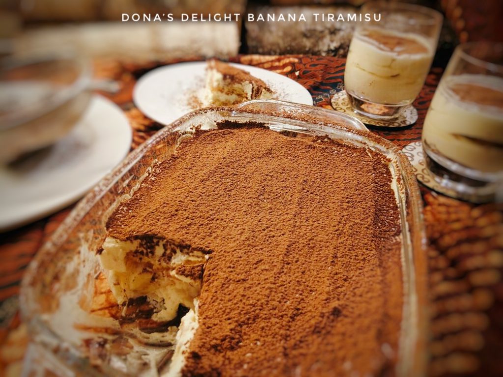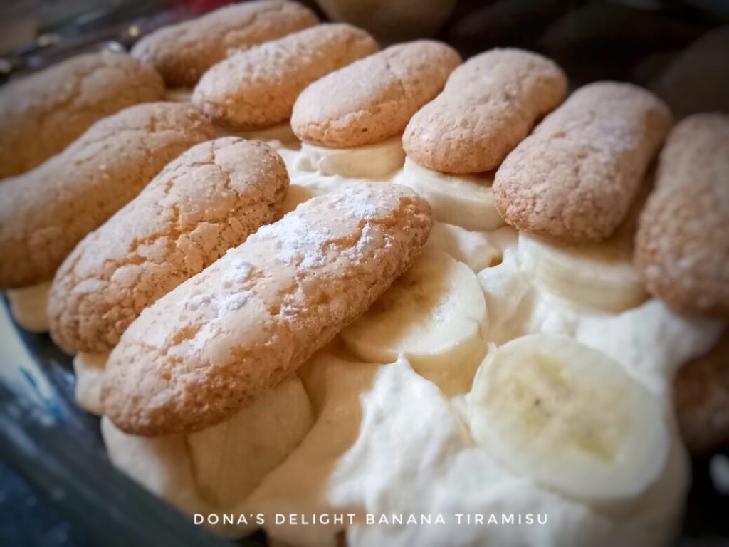 - Kembali tata lady fingers di atas campuran mascarpone, beri kopi dengan kuas, beri potongan-potongan pisang kemudian beri sisa campuran mascarpone.