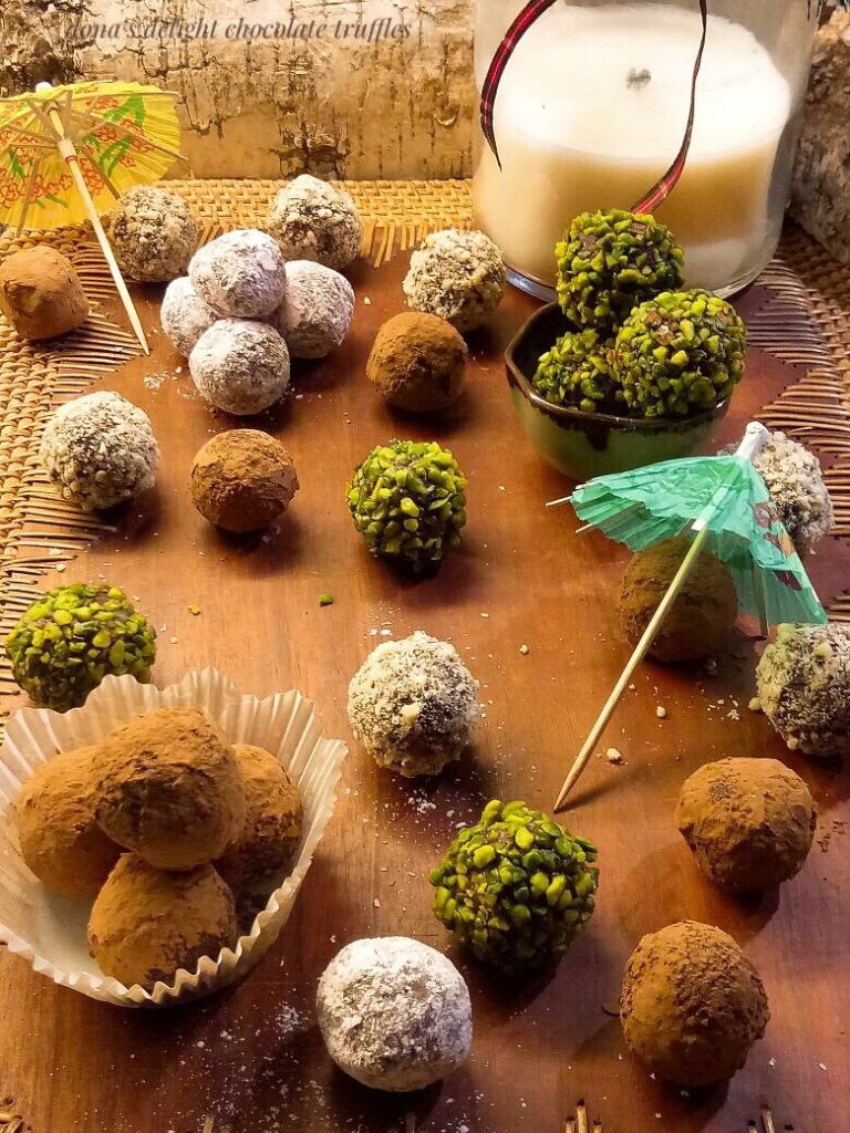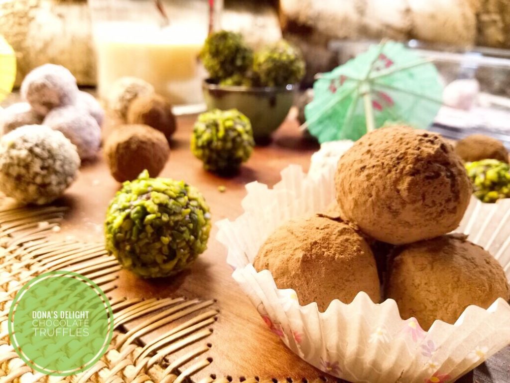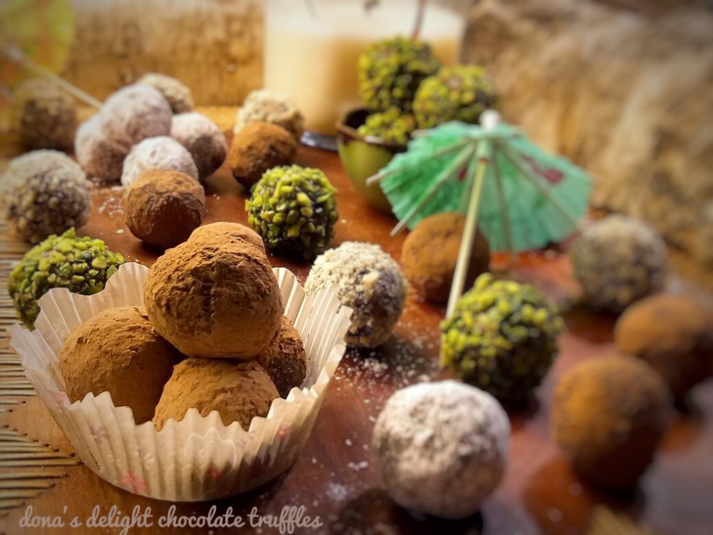 Paling malas tuh kalau bikin makanan yang sebetulnya bisa kita beli dan enak sekali, jadi kita ga perlu repot-repot bikin.  Kayak chocolate truffles ini, di Swiss tuh kan gudangnya coklat, jadi segala macam truffles ya ada, tinggal beli ga perlu repot dan terjamin keenakannya. Cuma yaitu, kalau di pikir-pikir sebetulnya boros juga ya kalau kita selalu beli yang sudah jadi, sedangkan kalau bikin sendiri itu mudah sekali, paling waktu kita aktiv bikinnya ga sampai 1 jam dan biaya beli bahan-bahannya bisa jauh lebih murah di banding beli jadi kenapa ga bikin sendiri aja? Ga tau resepnya? tinggal tanya google dan ratusan bahkan mungkin ribuan resep akan muncul, bikin bingung deh, karena komposisi dan jumlah bahan yang berbeda-beda. Seperti resep truffle ini bikin bingung karena ga ada satupun yang sama. Akhirnya tutup aja googlenya coba bikin sendiri, toh resep yang berseliweran berbeda-beda dan pasti ga akan bisa salah, seperti brownies aja, berapapun takaran coklat dan butter serta terigunya brownies akan tetap jadi hanya teksturnya yang berbeda. Nah kalau truffle ini sebetulnya hanya terbuat dari chocolate ganache, jadi berapapun komposisi cream dan chocolatenya insya allah akan tetap jadi ganache.  Dan akhirnya aku mencoba bikin ganache dengan takaran whipped cream yang berbeda, hasil akhir?.. aku tidak bisa membedakan hanya saja apabila pemakaian whipped cream lebih banyak akan menghasilkan lebih banyak truffles. Tapi mengingat iklim di Indonesia, aku pikir mungkin lebih baik aku berikan resep dengan pemakaian jumlah whipped cream yang lebih sedikit.