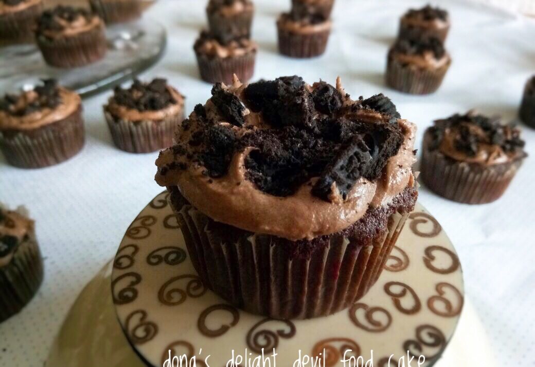 Cake klasiknya Amerika.. aku ga tau kenapa di sebut devil food cake mungkin karena cake ini sangat enak, ini sangat moist dan nyoklat banget, sangat kaya akan rasa, dan orang-orang jadi pingin makan banyak, dan merasa berdosa kalau makan banyak jadinya di bilang deh devil food cake, haha, ini aku cuma asal ngomong yah, kalau aslinya ya ga tau kenapa, bisa google sendiri ajah kenapanya. Nah sebetulnya cake ini biasanya terdiri dari 2 atau 3 layer/lapis cake yang di lapisi dengan frosting. Tapi aku kemaren karena teman minta bikinin cup cake dan aku tuh zaman aku masih baru-baru baking seringnya baking devil food cake ini, tapi karena dulu ga punya blog/website jadi ga kesimpen di web aku, makanya pas kebetulan ada temen minta bikinin cup cake ya sudah aku pake resep ini aja, sekalian buat aku simpen resepnya. Hehe kemaren sempet ketawa sih pas live ada yang komen baru tau devil food cake bisa dibikin cup cake. Soalnya memang aslinya ya ini cake untuk kue semacam tart gitu. Tapi yah sebetulnya semua cake sih bisa aja mau di bikin dengan loyang apapun, tinggal kita sesuaikan saja waktu pemanggangannya. Ok deh lanjut resepnya saja