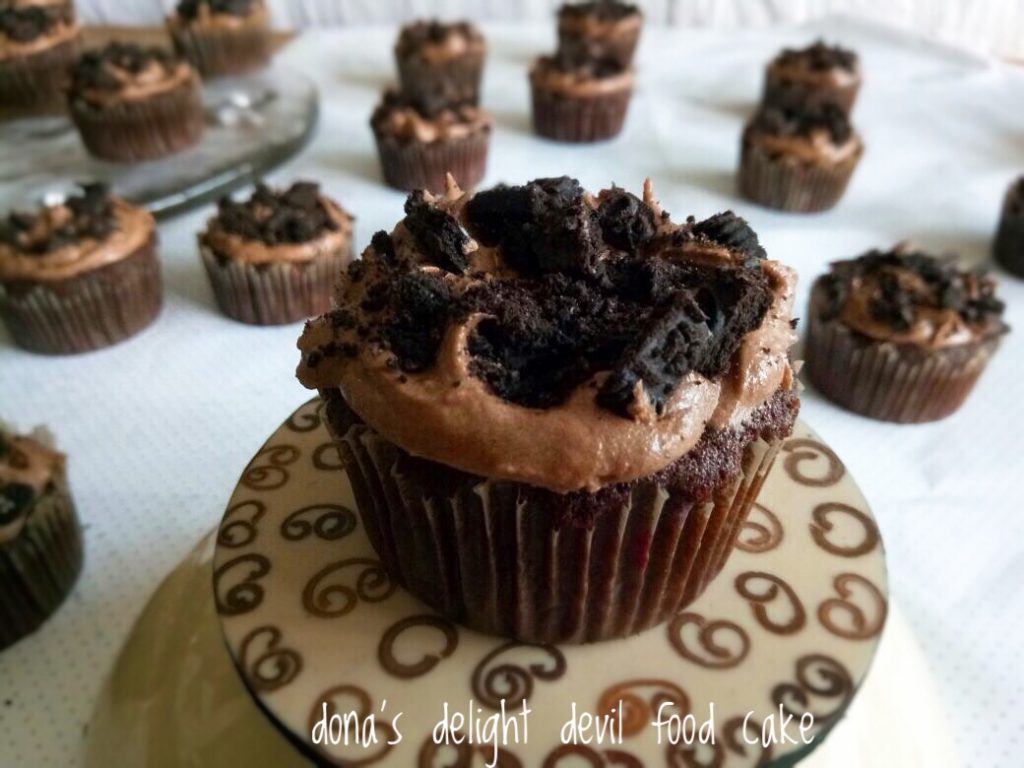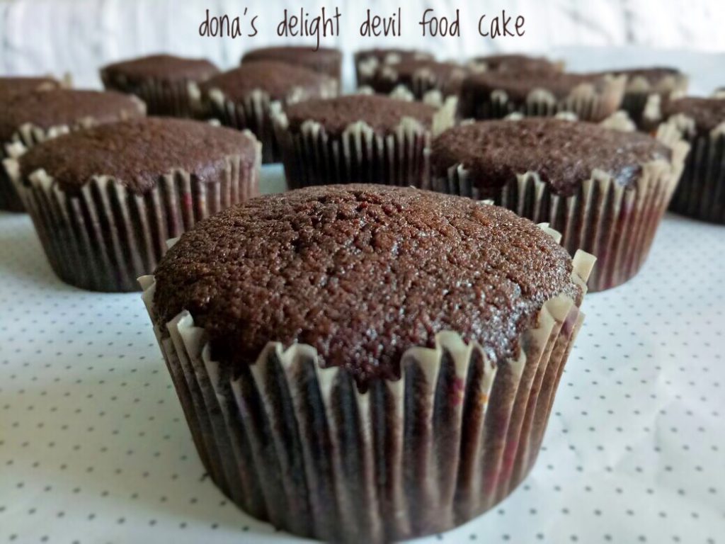 Cake klasiknya Amerika.. aku ga tau kenapa di sebut devil food cake mungkin karena cake ini sangat enak, ini sangat moist dan nyoklat banget, sangat kaya akan rasa, dan orang-orang jadi pingin makan banyak, dan merasa berdosa kalau makan banyak jadinya di bilang deh devil food cake, haha, ini aku cuma asal ngomong yah, kalau aslinya ya ga tau kenapa, bisa google sendiri ajah kenapanya. Nah sebetulnya cake ini biasanya terdiri dari 2 atau 3 layer/lapis cake yang di lapisi dengan frosting. Tapi aku kemaren karena teman minta bikinin cup cake dan aku tuh zaman aku masih baru-baru baking seringnya baking devil food cake ini, tapi karena dulu ga punya blog/website jadi ga kesimpen di web aku, makanya pas kebetulan ada temen minta bikinin cup cake ya sudah aku pake resep ini aja, sekalian buat aku simpen resepnya. Hehe kemaren sempet ketawa sih pas live ada yang komen baru tau devil food cake bisa dibikin cup cake. Soalnya memang aslinya ya ini cake untuk kue semacam tart gitu. Tapi yah sebetulnya semua cake sih bisa aja mau di bikin dengan loyang apapun, tinggal kita sesuaikan saja waktu pemanggangannya. Ok deh lanjut resepnya saja