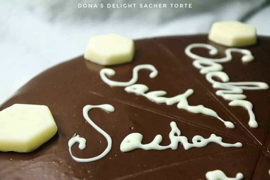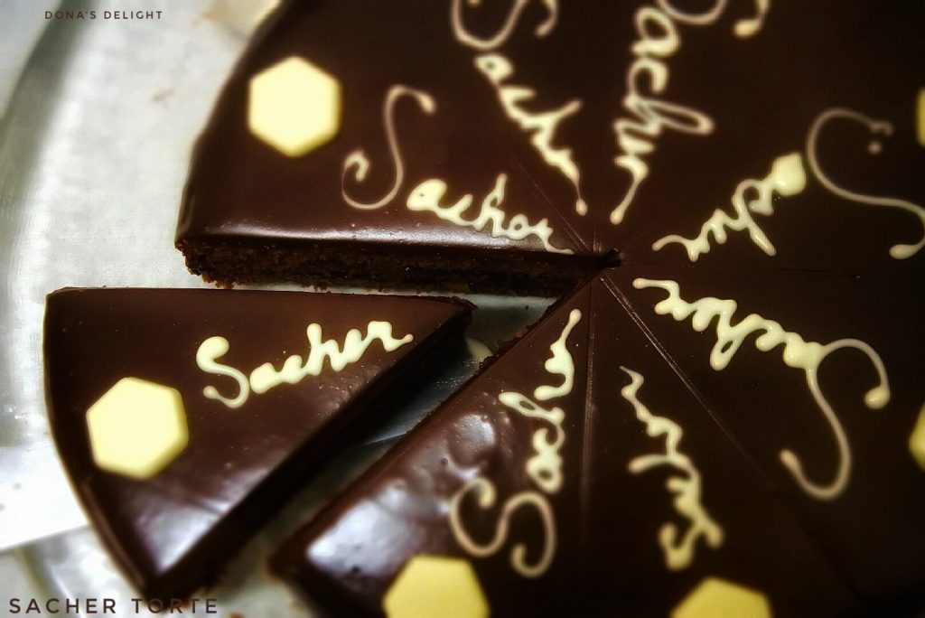- Tulis di tiap bagian kue denna bacaan Sacher, dengan menggunakan coklat putih yang telah kita lelehkan.